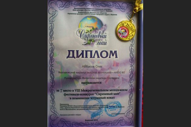 Студент ВИВТ Олег Аббасов занял первое место в номинации «Эстрадный вокал» на фестивале «Сиреневый май - 2016».
