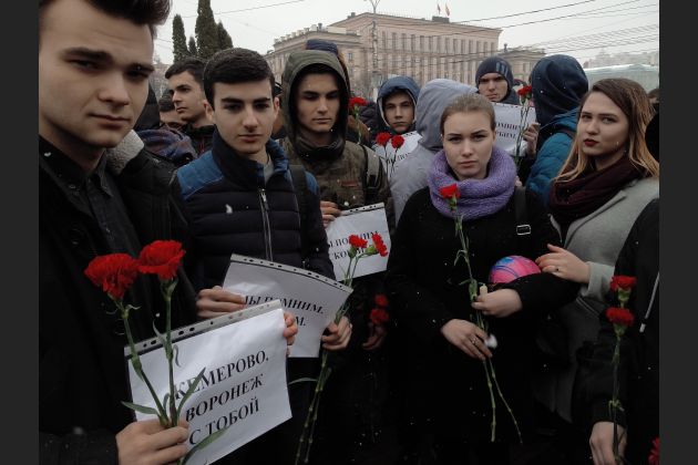 Это была молчаливая акция – слова поддержки студенты выразили на плакатах: «Кемерово, Воронеж с тобой», «Мы помним, скорбим».