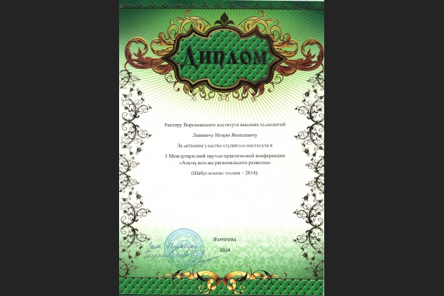 Воронежский институт высоких технологий представляла студентка факультета дневного обучения Ульяна Самойлова с докладом «Проблемы профессиональной ориентации молодых людей». По результатам выступления она была награждена грамотой.
