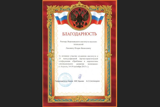 Представителем Воронежского института высоких технологий была студентка 3 курса Антонюшко В.А. с докладом «Вопросы использования инноваций в компаниях», в котором осветила методику оценки инвестиционной привлекательности компаний. По результатам работы конференции она была награждена дипломом.