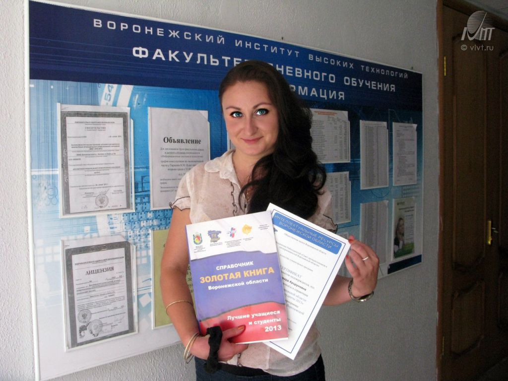Вышла в свет “Золотая книга Воронежской области: лучшие учащиеся и студенты 2013”, в этом году «золотыми» выпускниками стали более 1500 талантливых учащихся и студентов. Среди них – талантливая молодежь ВИВТ.
